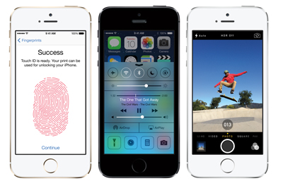 Equipé d’une puce A7 64 bits et d’un tout nouvel appareil photo iSight 8 mégapixels avec flash True Tone, l’iPhone 5s inaugure le capteur d’empreintes digitales Touch ID.